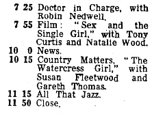 Principal competion came from The Road to Freedom over on BBC 2, and the final of the Omnibus: Leeds International Piano Competion on BBC 1. It was immediately preceded by the fifteen-minute Ten O'Clock News, but different ITV regions had carried a range of programmes in the earlier primetime slot. Grampian had shown Sunday with the Stars, Anglia had run the Glenn Ford movie Undercover Man, HTV had opted for quiz-show Mr and Mrs, with LWT showing the 1966 film The Quiller Memorandum, starring George Segal and Max Von Sydow. After The Watercress Girl, the ITV regions again went their separate ways, with ATV showing Spyforce, Scottish ITV running The Strange Report, HTV taking The Avengers, and Anglia opting for Department 'S'. The full broadcast history of The Watercress Girl remains unknown although the programme was shown early on in the life of Channel 4 (the transmission from which the screengrabs used here were sourced), it is not clear how many times the drama has been shown on British screens. The plotAs the story opens, Mary is tending to her watercress crop growing along the riverbank close to the farm run by her widower father. She is visited by local woodturner Frank Oppidan who persuades her to begin a courtship that quickly becomes passionate and intense. Frank is anxious to settle down and set up his own business, and presses Mary to accept his proposal of marriage. She refuses, insisting that their relationship must continue outside of wedlock. Tensions between the couple rise, and as their rowing reaches deadlock, Frank vows never to return. He soon discovers, however, that he cannot keep away but on returning to Mary's side, their conflicts resume, and he departs once more, insisting that he will "not set sight on her no more". Working as an odd-job man, he soon finds solace in the arms of Elizabeth Plantley, a young and lonely woman grieving the loss of her father and now "all alone in the world", who quickly agrees to get engaged.